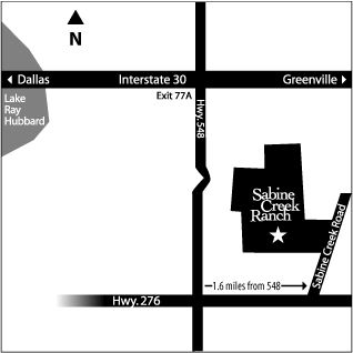 WATCH YOUR ODOMETER!!! - Sabine Creek Road can be easy to miss, especially at night. There are two roads within about 50 feet of each other on the north side of Hwy. 276. Sabine Creek Road is the 2nd one (if you're coming from the direction of Rockwall). These roads are at the end of a very long white board fence on the left. If you come to a section of Hwy. 276 that is divided and goes to four lanes, you just missed us.